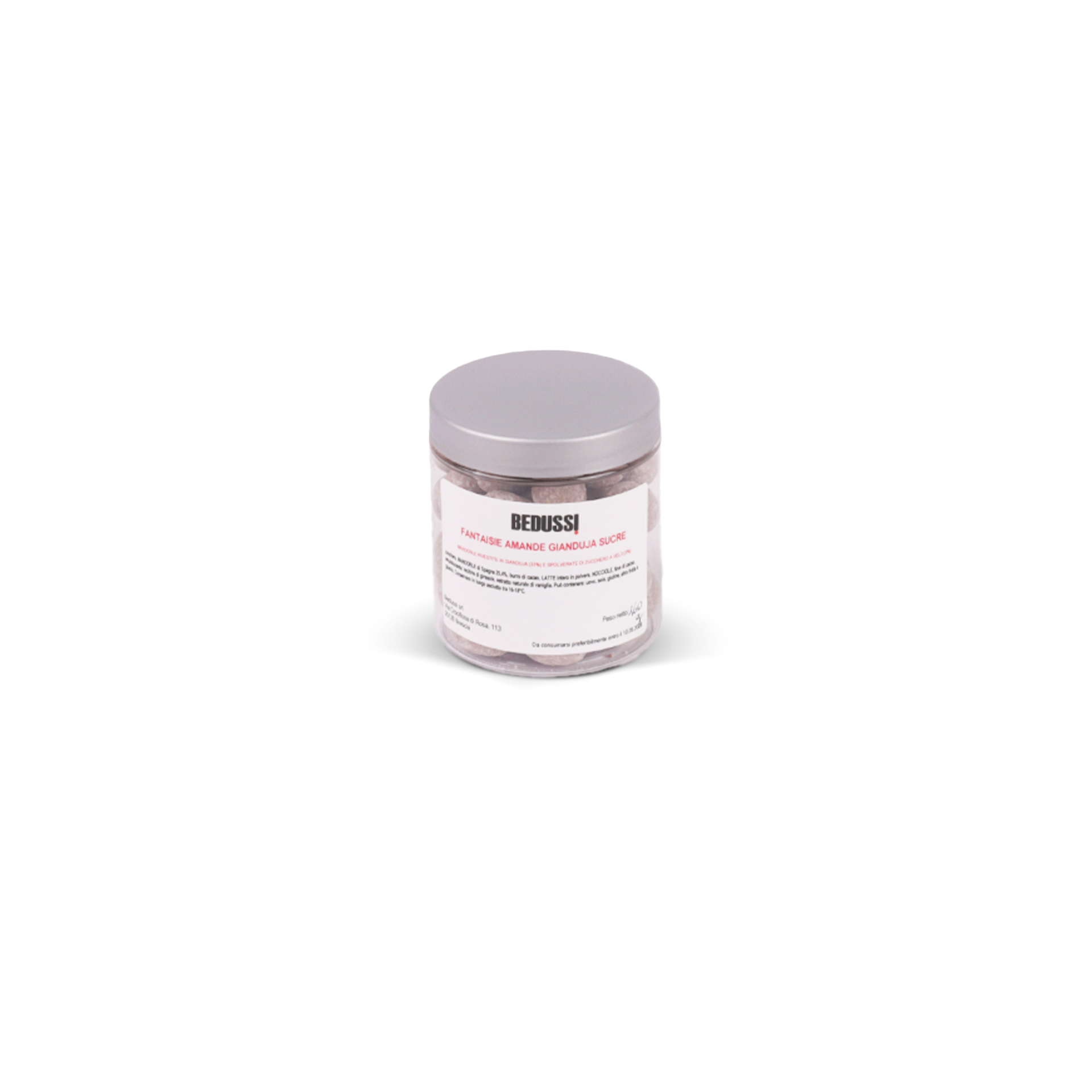 | INGREDIENTI | Zucchero, mandorle, latte intero in polvere, burro di cacao, fave di cacao, emulsionante: lecitine, addensante: gomma arabica, estratto di spirulina, coloranti: E100, E162, aroma naturale di vaniglia con altri aromi naturali. Agenti di rivestimento: cera d'api, cera di carnauba, estratto naturale di vaniglia. Può contenere: soia, uova, glutine, altra frutta guscio. |